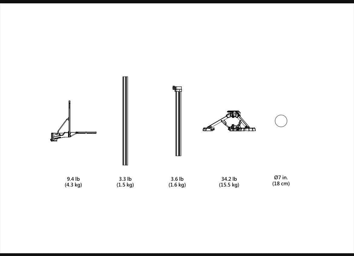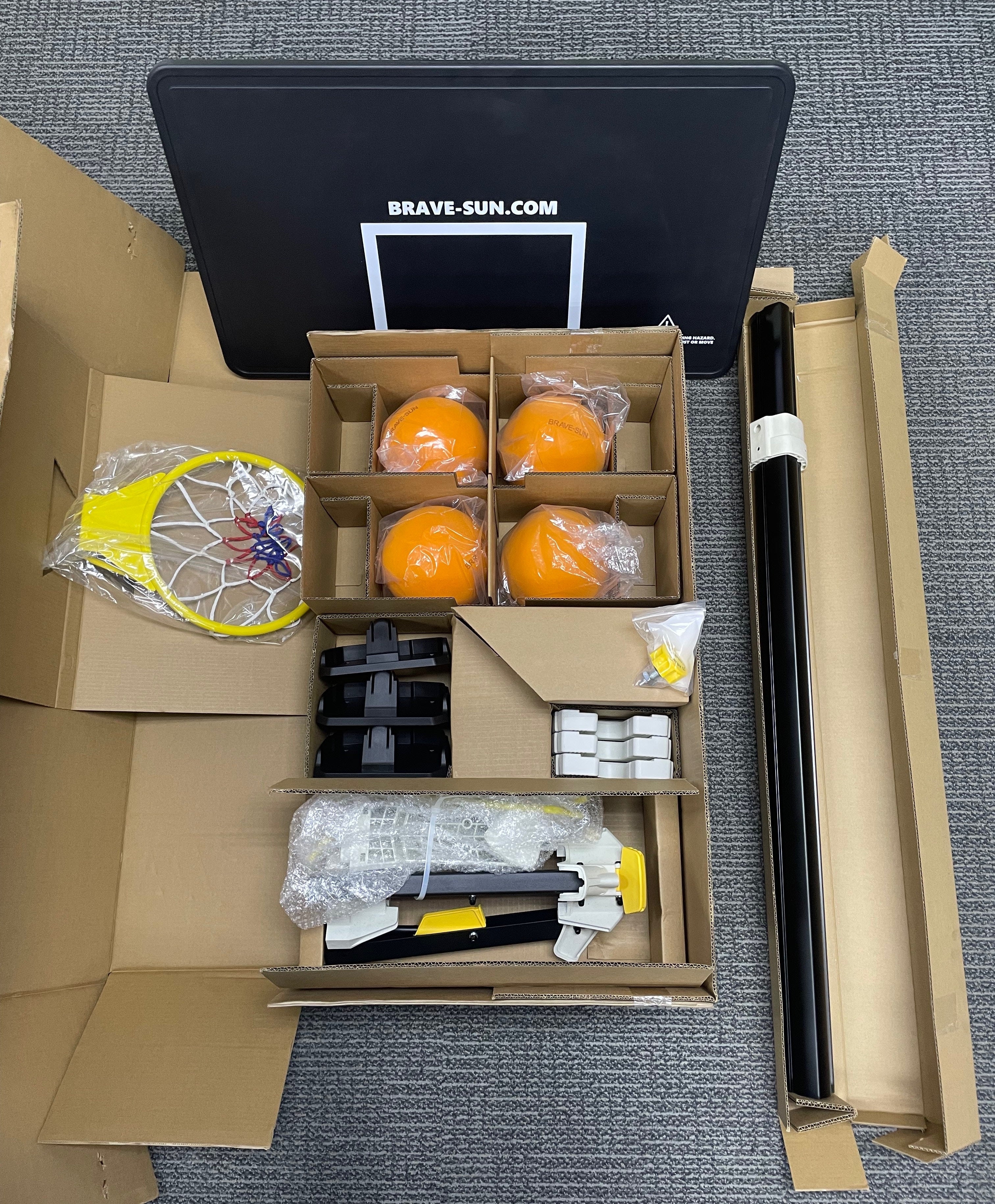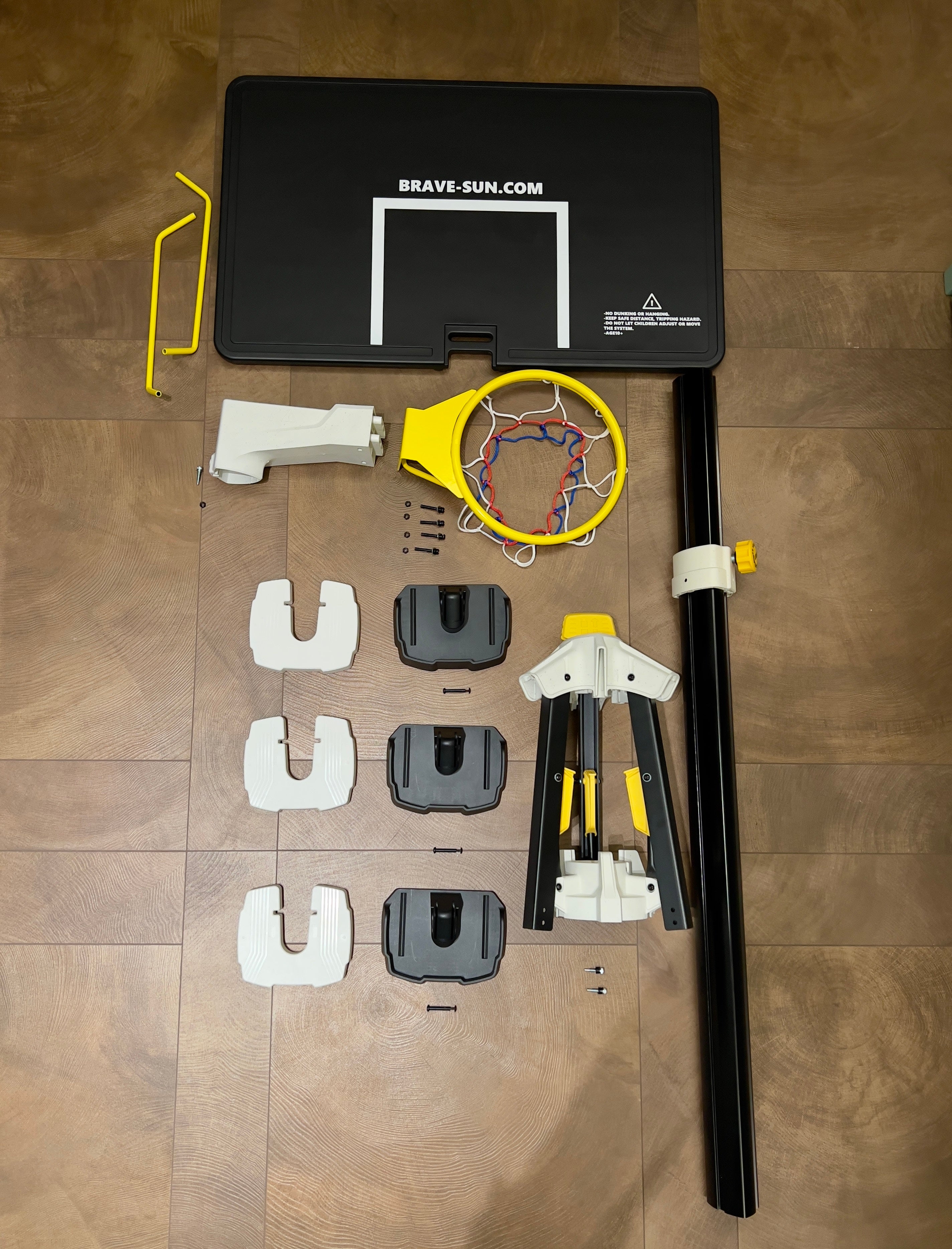 -1 Rim and Net. (diameter: 11 inches / 28 cm) -1 Backboard and 2 supporters. -1 Neck. -2 Aluminum poles. (inner and outer) -1 Height adjustment Knob and nut. -1 Tripod base. -3 Weight Holders. (Tripod Feet) -3 Weight plates. (8 lb/ 3.6 kg each) -4 Orange Foam Balls. (100.0% Polyurethane) (diameter: 7 inches / 18 cm)